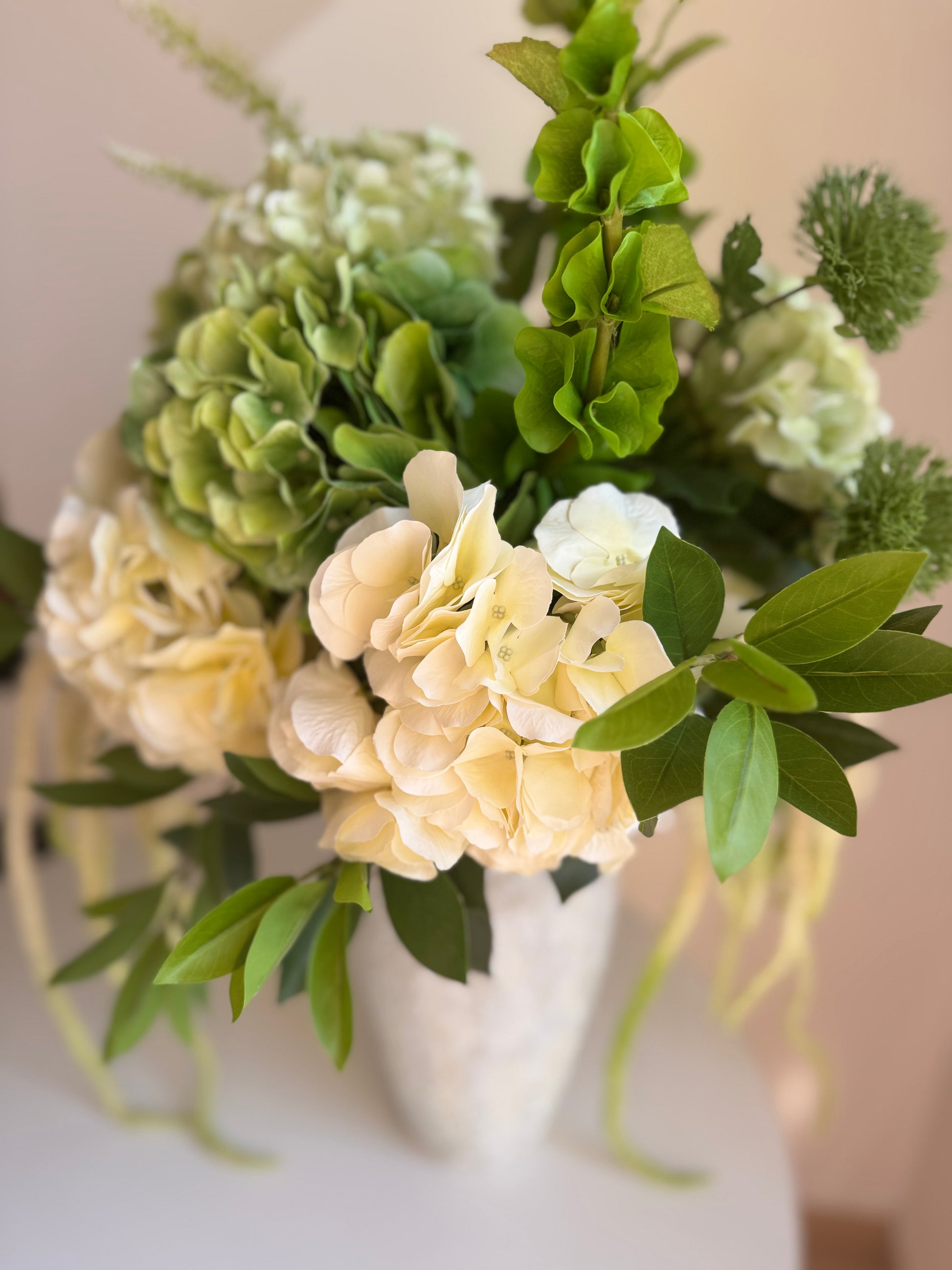 Our flowers are versatile and you may opt to set them up as seen in our website photo or create your own unique arrangement. The stems and leaves can be gently bent and shaped to achieve the desired look.
